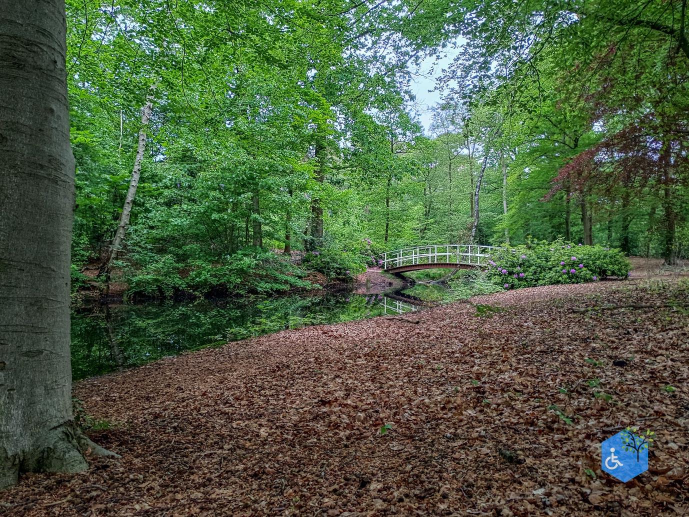 De eerste brug die je tegenkomt is een brede brug over de vijver. Deze brug is geen onderdeel van de route, maar het uitzicht over de vijver is wel de moeite waard. Om de brug op te komen moet je een hobbel nemen, het zand voor de brug is namelijk wat weggespoeld waardoor de brug vrij hoog ligt. De tweede brug die je tegenkomt ga je wel over. Deze brug is 1,2m ongeveer breed maar vrij steil. Ook bij deze brug is er wat zand weggespoeld voor de brug, waardoor er ook hier een drempel is ontstaan.